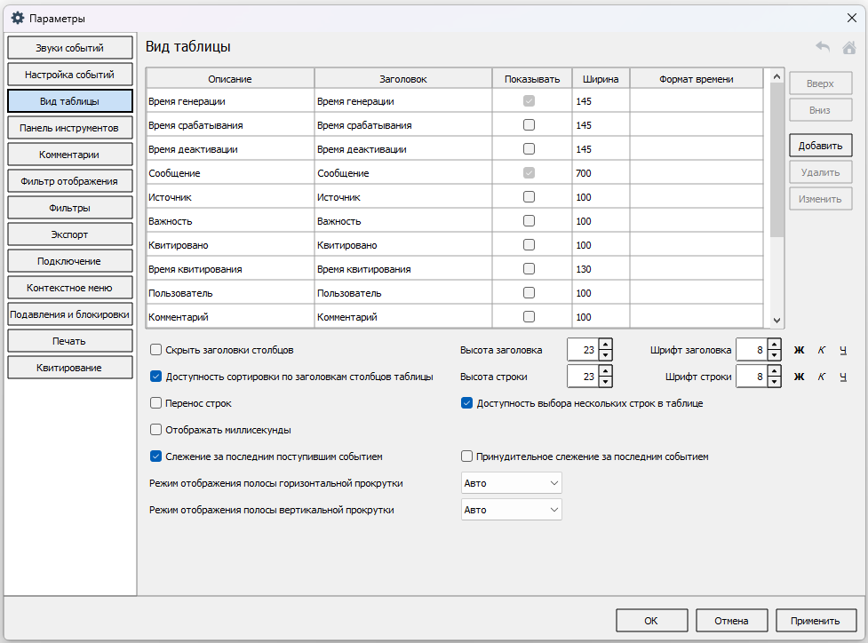 Чтобы настроить дополнительные параметры отображения в таблице событий, установите флаг у необходимых функций отображения на вкладке Вид таблицы и сохраните изменения.