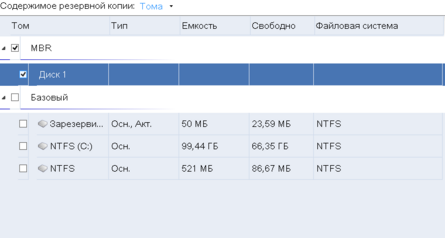 В разделе "Содержимое резервной копии" выберите необходимые тома для восстановления и нажмите кнопку "ОК".