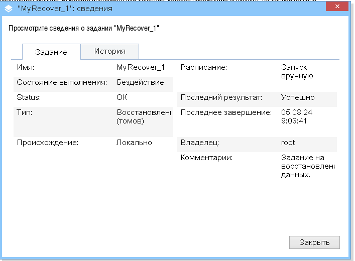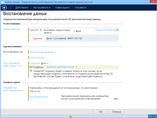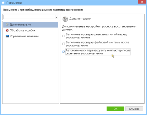 10. Опционально в разделе "Параметры задания" во вкладке "Дополнительно" установите флаг "Автоматически перезагрузить компьютер после окончания восстановления" и нажмите "ОК".