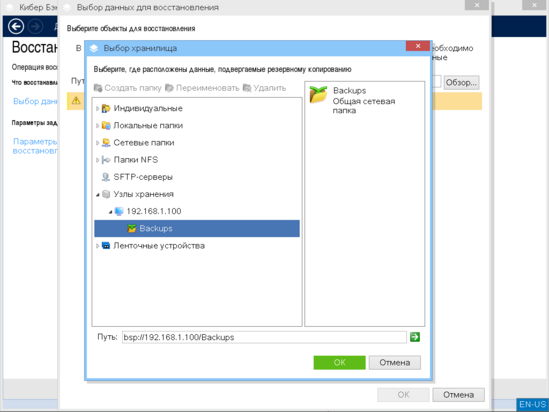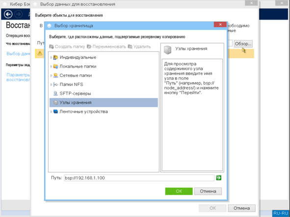 Выберите узел хранения с резервными копиями и нажмите кнопку "ОК".
