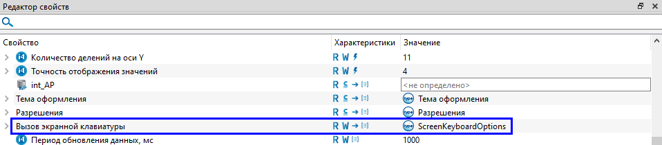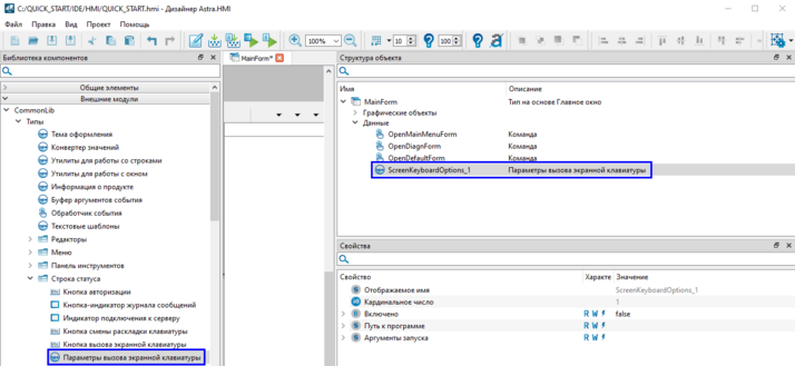 Чтобы добавить экземпляр типа ScreenKeyboardOptions в проект, перетяните тип на рабочую область. Компонент невизуальный и отображается в области Структура объекта.