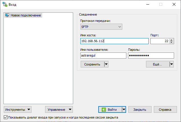 11. В поле "Имя хоста" укажите IP адрес виртуальной машины, значение в поле "Порт" оставить без изменений. В поле "Имя пользователя" введите имя пользователя. В поле "Пароль" укажите пароль пользователя. Нажмите кнопку "Войти".