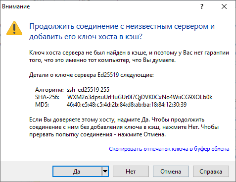 12. При первом подключении откроется окно с предупреждением о продолжении соединения с неизвестным сервером. Нажмите "Да".