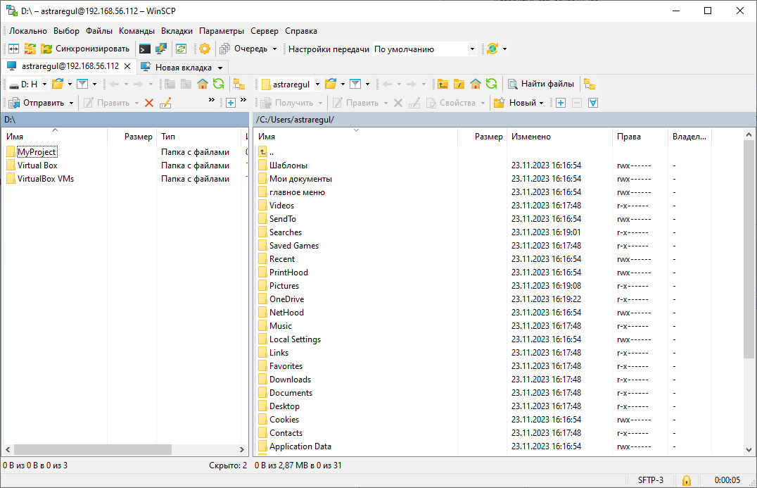 13. После подключения, в правой части окна "WinSCP" отображаются файлы и директории, находящиеся на ВМ. В левой части - файлы и директории ПК, с которого произведено подключение.