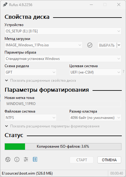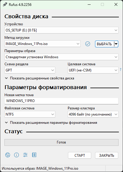 5. Все параметры оставьте по умолчанию и нажмите кнопку "СТАРТ".