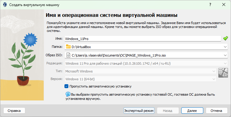 2. Введите в поле "Имя" название виртуальной машины, в поле "Папка" выберите путь до файла с образом ОС в формате *.iso. Установите флаг "Пропустить автоматическую установку" и нажмите кнопку "Далее".