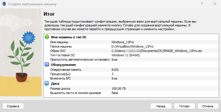 5. В окне "Итог" проверьте конфигурацию виртуальной машины и нажмите кнопку "Готово".