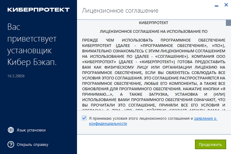 2. Внимательно прочитайте лицензионное соглашение, установите флаг "Я принимаю условия этого лицензионного соглашения и заявления о конфиденциальности" и нажмите кнопку "Продолжить".