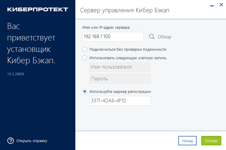 4. Настройте подключение к серверу управления Кибер Бэкап. Укажите IP-адрес сервера, выберите пункт "Использовать маркер регистрации" и вставьте сгенерированный на сервере маркер регистрации. Нажмите кнопку "Готово".