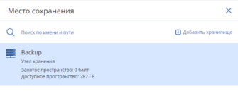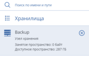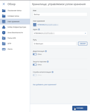 5. В открывшейся панели выберите вкладку "Узел хранения", задайте ему имя и установите путь до каталога, где будут храниться резервные копии и нажмите кнопку "Готово".