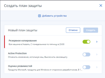 7. В открывшейся панели укажите название плана и включите функцию "Резервное копирование". При необходимости также включите "Active Protection" и "Оценка уязвимостей".