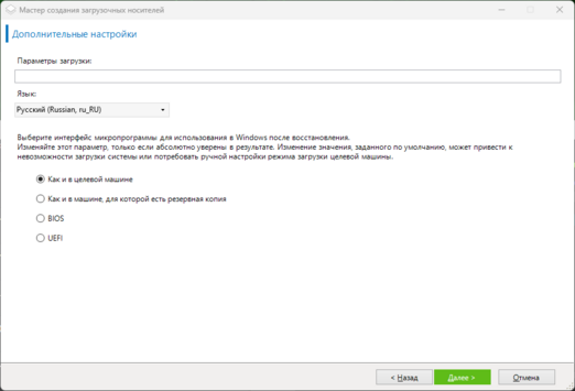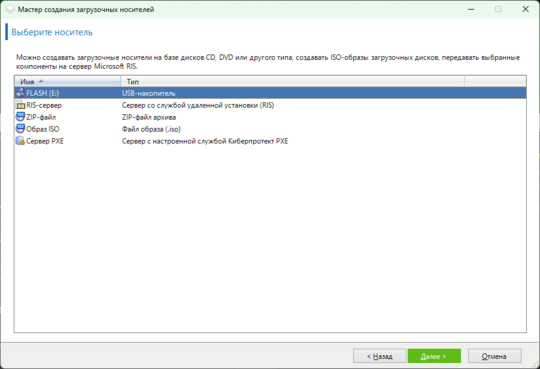 6. Выберите компоненты, которые будут установлены на загрузочном носителе в зависимости от типа компьютера и нажмите кнопку далее.