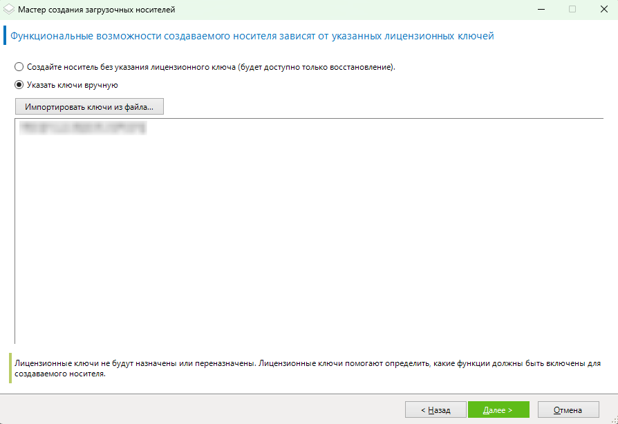 3. Выберите пункт "Указать ключи вручную" и укажите лицензионный ключ Кибер Бэкап. Этот ключ используется для определения функций, которые будут представлены на загрузочном носителе. Нажмите кнопку "Далее".