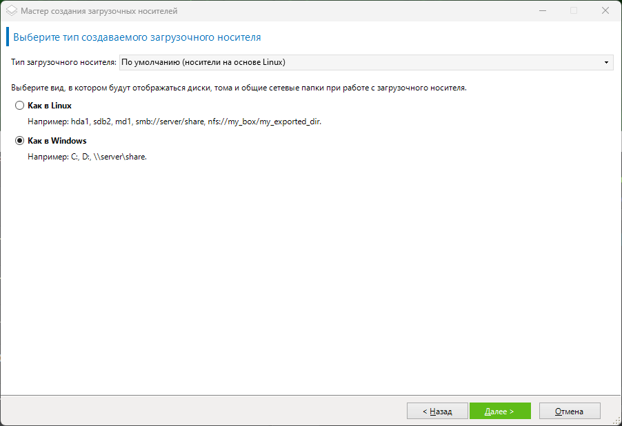 4. Выберите "Тип загрузочного носителя" и способ представления томов и сетевых ресурсов: