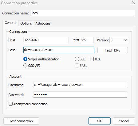 По-умолчанию на ОС Windows: "cn=Manager,dc=maxcrc,dc=com", пароль: "secret";