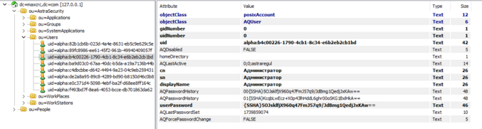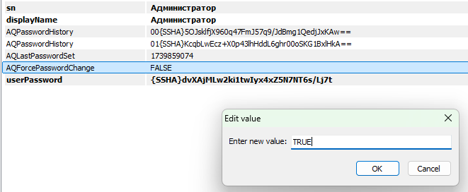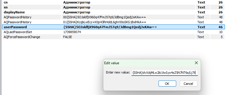 4.Скопируйте полученное значение зашифрованного пароля и измените параметр "userPassword" у пользователя в LDAP Admin:
