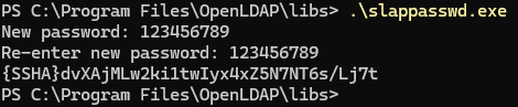 3. Перед изменением пароля необходимо зашифровать новый пароль. Для этого перейдите в каталог "C:\Program Files\OpenLDAP\libs", откройте каталог в командной строке и запустите утилиту "slappasswd.exe". Укажите новый пароль и скопируйте полученную строку.