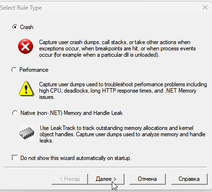 2. В открывшемся окне приложения выберите пункт "Crash" и нажмите кнопку "Далее".