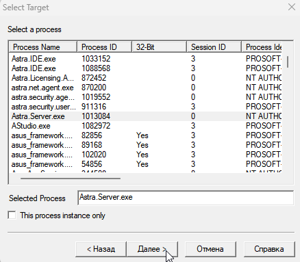 4. Выберите процесс, по которому необходимо снять дамп и нажмите кнопку "Далее".