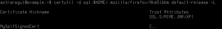 certutil -d sql:$HOME/.mozilla/firefox/xxxxxxxx.default-release -L