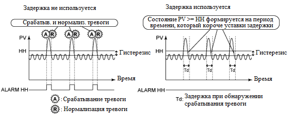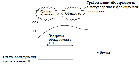 Когда переменная процесса (PV) выходит за пределы или фиксируется на границе значений уставки сигнала тревоги HH, LL, HI или LO, отложенное обнаружение срабатывает для активации сигнала тревоги HH, LL, HI или LO. Если данное значение остается дольше установленного времени задержки, возникновение HH, LL, HI или LO отражается в состоянии сигнала тревоги и генерируется сообщение активации сигнала тревоги.