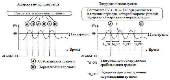 Активация сигнала тревоги не обнаруживается сразу после того, как переменная процесса (PV) выходит за пределы диапазона уставки сигнала тревоги. PV должен оставаться вне этого диапазона в течение периода времени, указанного пользователем, прежде чем будет обнаружена активация сигнала тревоги.