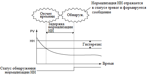 Отложенное обнаружение работает для восстановления из аварийного сигнала HH или HI, когда переменная процесса (PV) падает ниже «уставка аварийного сигнала - гистерезис». Если PV остается ниже этого уровня дольше установленного времени задержки, восстановление из HH или HI отражается в состоянии аварийного сигнала и генерируется сообщение о восстановлении.