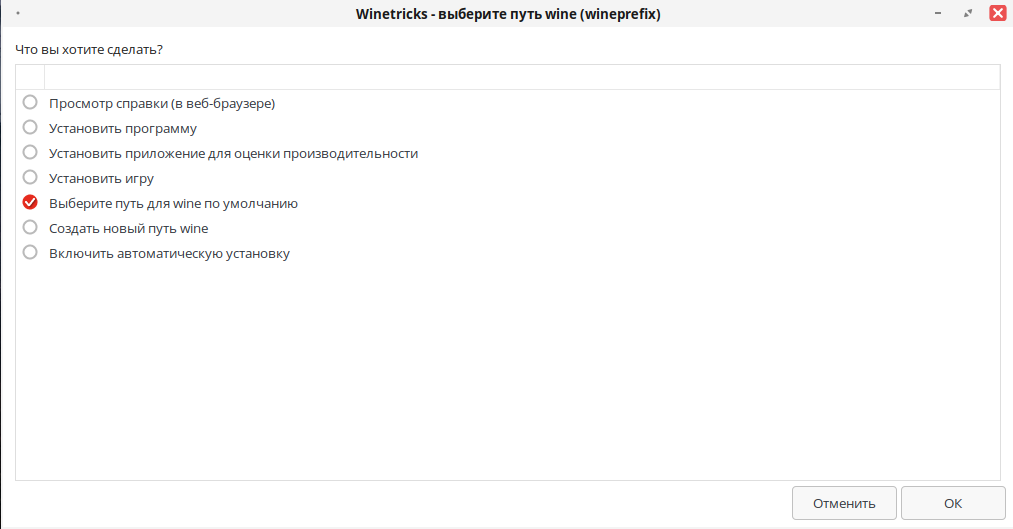 2. В открывшемся окне выберите "Выберите путь для wine по умолчанию " и нажмите кнопку "ОК".