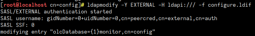 ldapmodify -Y EXTERNAL -H ldapi:/// -f configure.ldif
