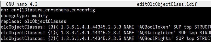 15. Откройте файл "editOlcObjectClass.ldif" и замените в значение атрибута "dn: cn={x}astra,cn=schema,cn=config" значение "x" на значение, полученное в п.12.