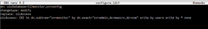 6. Для конфигурации монитора создайте и откройте файл "configure.ldif", выполнив команду: